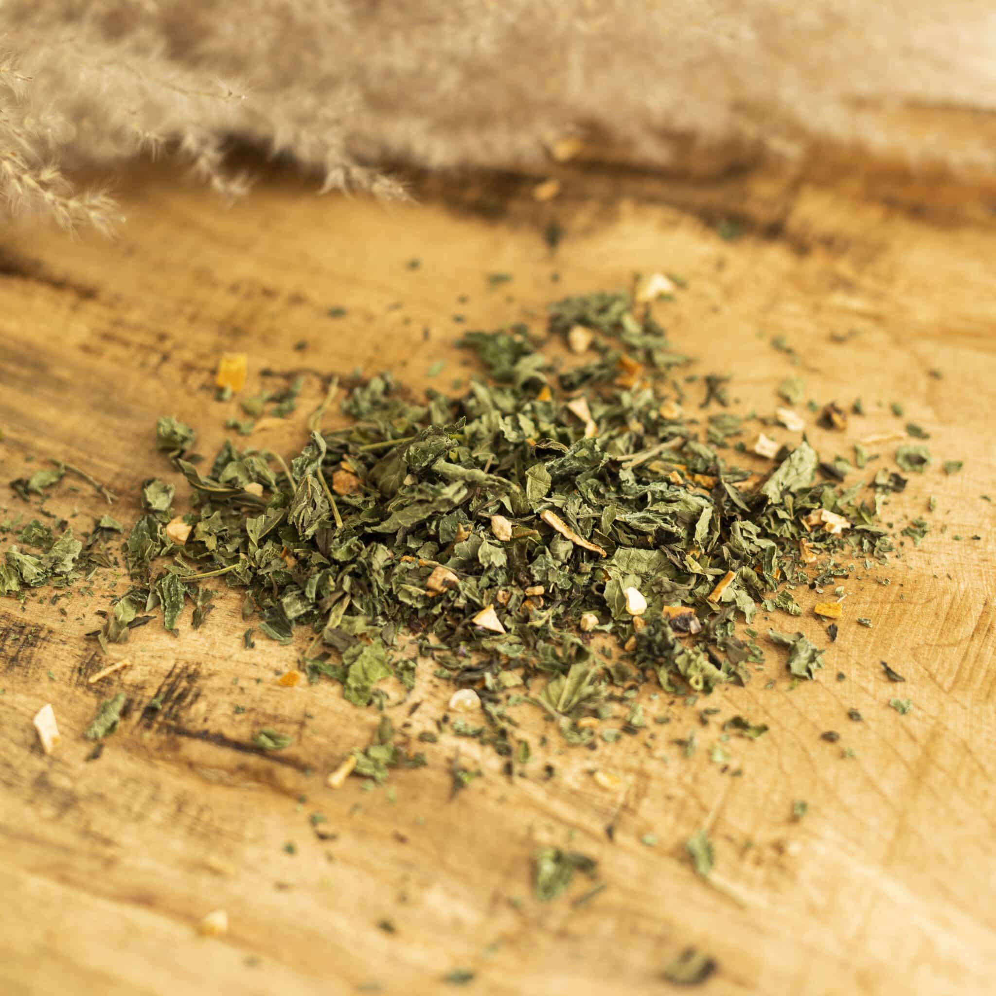Mélisse du jardin, menthe poivrée du jardin, pelure de citron bio, stévia du jardin.