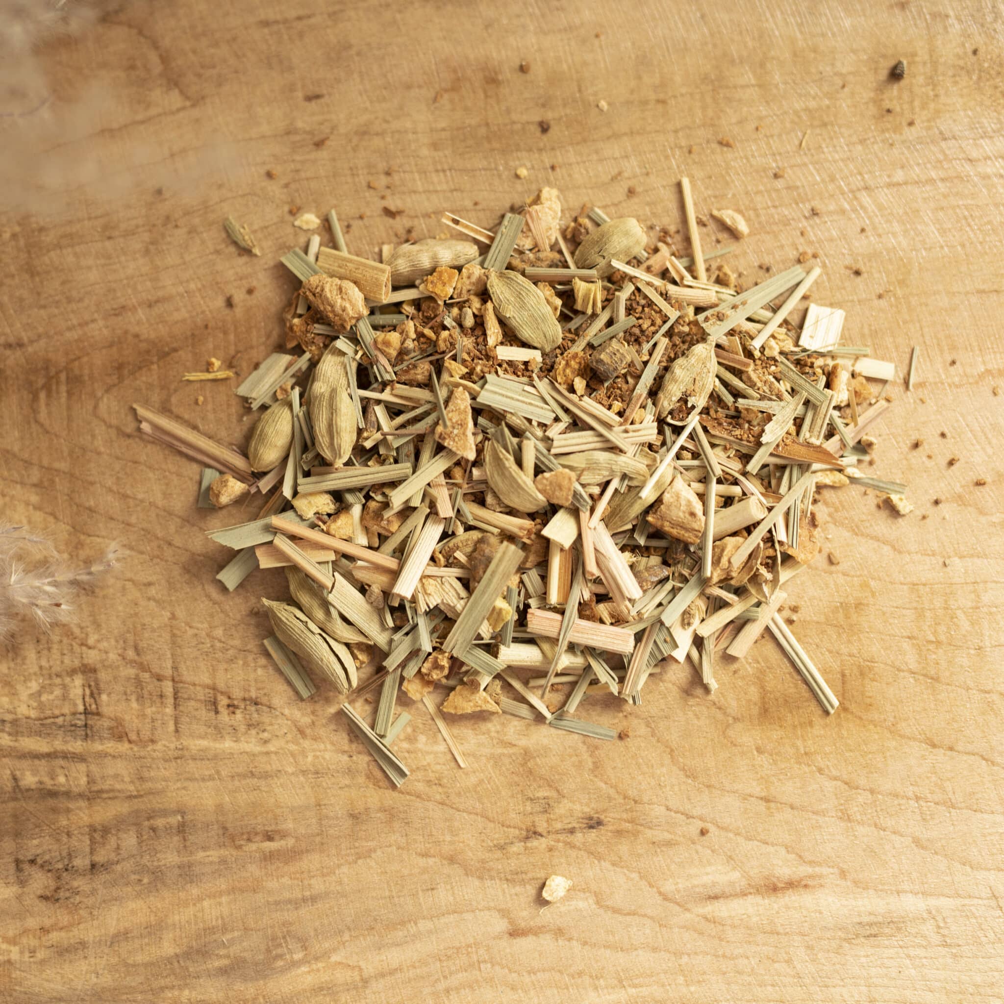 Cannelle biologique, cardamome biologique, citronnelle biologique, gingembre biologique, orange biologique et réglisse biologique.